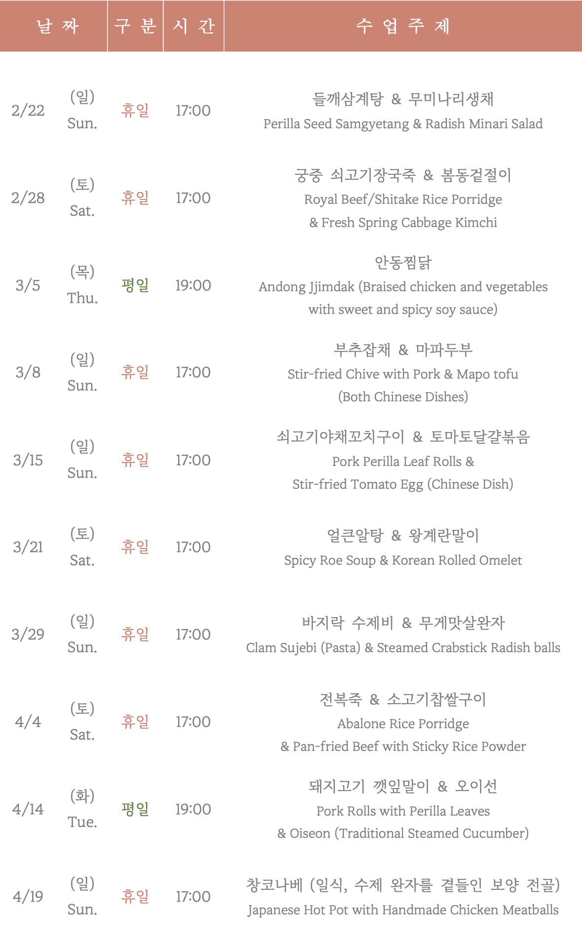 HOME| [강의일정안내] 2026년 2월-4월 쿠킹클래스 일정입니다. 2026.02.19 | |||||